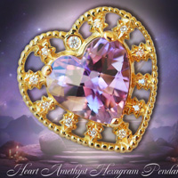 透明感あふれる艶のあるアメジストをお預かりしましたので、アメジストにピッタリなデザインをご提案させていただきました。 美とミスティリアスなイメージが同居している様なオリジナリティあふれるジュエリーが仕上がり、喜んでいただきました。 ハートカットのアメジストの周りには、六芒星を11つ散りばめ、メレダイヤをセッティングしています。 バチカンでつるさず、裏側に透かしの部分から見えないように金具を取り付けていますので、よりエレガントに仕上がっています。 普段使いから特別なシーンまで、幅広くお使い頂けるジュエリーです。