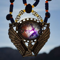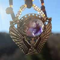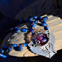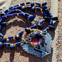 レッドカラーの美しいゲーサイトが内包されたインド産のアメジストをメインストーンとして、翼を広げたイシス女神とウジャトの眼をあしらったデザインになっています。ネックレス部分の中央には、スカラベカービングのラピスラズリを使い、その周りにデュモルチェライトとカーネリアン、チューブ状のラピスラズリを使ってデコラティブに仕上げました。 ネックレスのアジャスター部は、古代エジプトの永遠を表す紋章「シェン(シェヌ)」の形を装飾しています。
