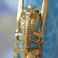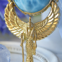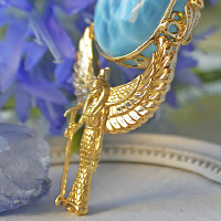ラリマーの石座には、透かしのアンクが一周取り囲み、両サイドにはコブラの女神「ウアジェト」が鎮座しております。ラリマーの上には、猫の女神であるバステトをピンクゴールドを、ラリマーの下には有翼のイシス女神を雄大に装飾しております。