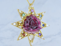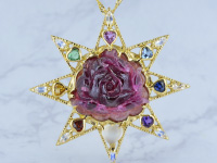 ピンクトルマリンローズの周りには、8石のハート型のストーンが散りばめられ、その周りにロイヤルブルーむんストーンを配置しています。ジュエリーの裏側には、聖母マリアの目だいを埋め込み、エネルギーの広がりと薔薇をイメージして、メレダイヤを散りばめ装飾を施しています。