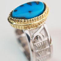 鮮やかで色濃い美しいビズビーターコイズに圧巻です。ジュエリーのデザインは、ビズビーターコイズとワークしいただいたデザインです。 古代エジプトの神々でも古くから信仰されている創造神であるプタハ神がビジョンに現れました。 こちらのリングは、プタハ神の持っている杖をリングサイドに装飾しています。
