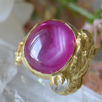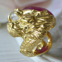 六角柱に結晶するルビーの構造上の特徴が表面に魅惑的に浮かび上がったルビー(加工品)を使った龍神と睚眦をデザインしたシルバーリングを仕上げました。