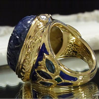 サファイアのサイドには唐草模様を装飾し、上下にロータスカットのダイヤモンドを合わせています。ジュエリー詳細