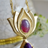 そのスギライトガネーシャ様から受け取ったジュエリーのビジョンを気に入っていただき、ジュエリーにお仕立てさせて頂きました。スギライトガネーシャ神の頭上には、美しく花開いた蓮の花が輝いています。 蓮の花の中央には、ベトナム産のバイカラーサファイアをセッティングしております。