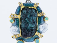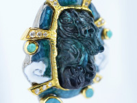 インディゴライトに青龍カービングを施した当店の作品と、お客様が大切にされていた特殊な成分を持つパライバトルマリンを組み合わせ、偉大な青龍が湖から天空に飛翔する様をデザインしたジュエリーに仕上げました。