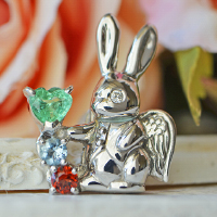 子供のウサギちゃんは垂れ耳スタイルで、パパウサギちゃんはベストを着たカッコイイスタイルの姿にデザインしています。天然石は、ご家族の誕生石であるエメラルド、アクアマリン、ガーネット、そして愛犬の誕生石であるダイヤモンドをセッティング。