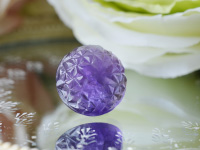 アメジストのラウンドカボションに、六条のスターと、三角錐やダイヤ型を立体に削り出した力作です。