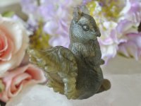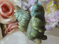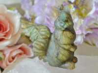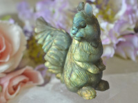 ゴールドカラーの輝きが美しいラブラドライトに彫刻されたリアルなリスのカービングクリスタルをご紹介します。