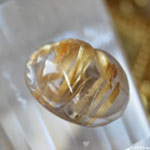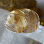 束上の太いルチルが内包されたルチルクォーツをスカラベカービングにお仕立いたしました。