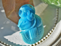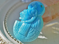 石の種類 ターコイズ 産地情報 アリゾナ州スリーピングビューティ鉱山 重量 28.37ct サイズ 30.4×19.8×7.8mm クラリティ 不透明 形状 カービング エンハンスメント 不明 スリーピングビューティターコイズセクメト女神カービング