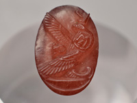メキシコ産のストロベリークォーツのカボションの裏側に、古代エジプトのコブラの女神「ウアジェト」をカービングしたスペシャルなお品をご紹介します。