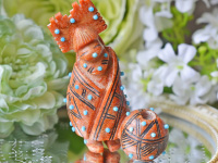 フェティッシュは主に、石に動物などの姿を彫り込んで、創造主の使者である動物の精霊を呼び起こすという目的で作られているようです。こちらのフェティッシュは、水をまく壺と乙女を表現しています。