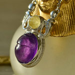 鮮やかなカラーをしたアメジストをスカラベにカービングし、ゴールデンダンビュライトと組み合わせて古代エジプトデザインのジュエリーにお仕立いたしました。