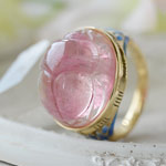 石の種類 ピンクトルマリン 天然石詳細 ブラジル産 17.5×15.4mm(18.03ct) 素材 K18 Yellow Gold 重量 11.46g ジュエリーサイズ 21.0×16mm リングサイズ 12号 ピンクトルマリンスカラベ七宝ブルーロータスK18リング