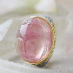 透明感の高いかわいらしいピンクカラーをしたトルマリンにスカラベをカービングし、エジプシャンロータス(睡蓮)の装飾でデザインした当店オリジナルのジュエリーです。