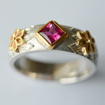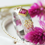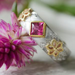 ジュエリーをお仕立する際に、輝くインスピレーションを受け取ったことから、この名前を名付けました。ピンクトルマリンの両サイドにセットしたゴールドのお花の周りには、拡大する輝くオーラを彫り込んでいます。