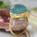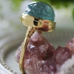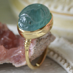 イエローゴールドにグランディディエライトの独特のブルーグリーンが映えて、大変魅惑的なジュエリーです。デザインは、古代エジプト時代に見られる、スカラベをワイヤーでリングに留めているスタイルのリングをベースにしています。