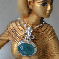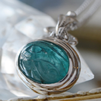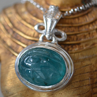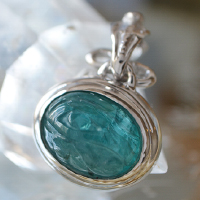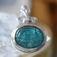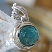 透明度の高いグランディディエライトに、古代エジプトのウジャトの眼を彫り込んだシルバージュエリーです。