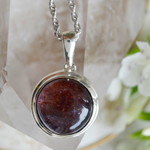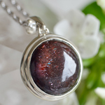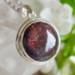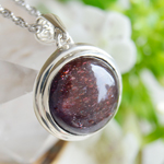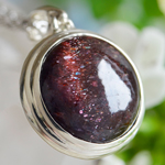 ペンダントを傾けると、縦方向にシラー(キャッツアイ効果)が出ます。アイオライトにレピドクロサイトが影響することで生まれる、独特の赤い光は、妖艶でエキゾチック。