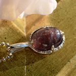 スミレ色のアイオライトとアベンチュレッセンス効果を持つオレンジのサンストーンが組み合わさることで、なんとも魅惑的な光を作り出していますね。