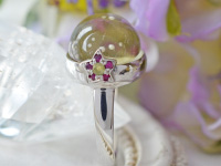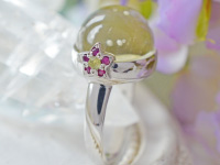 太古の地球に暮らした恐竜と、そして太古の昔に地球に衝突した隕石から形成されたとされるリビアングラスの組み合わせです。リングサイドの星の中にはルビー5石とクリソベリルのラウンドカットをセッティングしています。