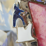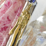 こちらは長く大切にしてきたストーンです。ピンクスギライトの両サイドには、左側にアヌビス神(七宝)、右側にマアト女神(K18イエローゴールド)をデザインにしています。
