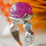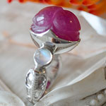 ルビーにスカラベを施し、レインボームーンストーンを左右にセッティングした神秘的なジュエリーです。