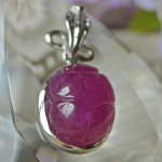 そのスカラベをシンプルにペンダントに仕上げております。ルビーはガラス含侵タイプのものですが、色彩が鮮やかで大変美しいですよ。