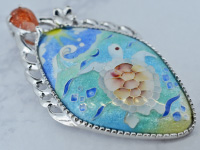 白い動物シリーズ第二弾は、マリンブルーの海を優雅に泳ぐ白いホヌ(ウミガメ)を有線七宝で表現した七宝ジュエリーです。