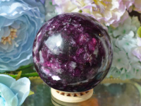色彩の淡いものが多いレピドライトですが、アメジストを横に置いても負けないくらい濃い色彩をした美しいレピドライトのスフィアです。