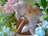 そこで他にはない特別なスタンドをご用意させていただきました。こちらのピンクアメジストは大海原を自由に遊ぶ天才、かわいいイルカの形にお仕立てさせていただきました。